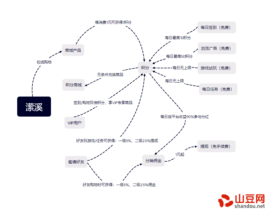 2,推广好友赚:让你的团队来玩游戏、做任务、购物,你拿5%、2.5%的积分提成,并且推广等级越高积分提成越高,最高50%;